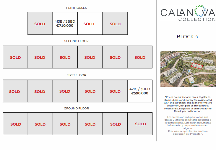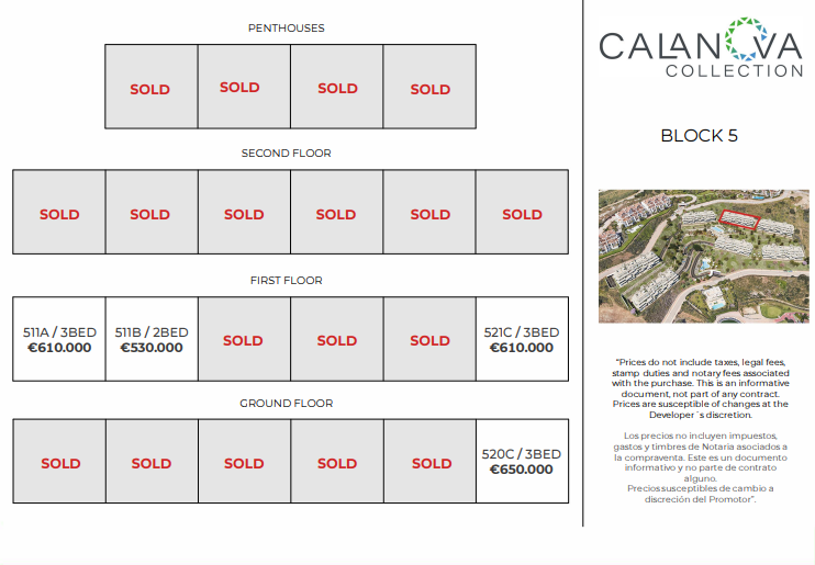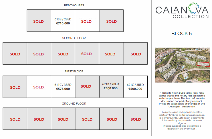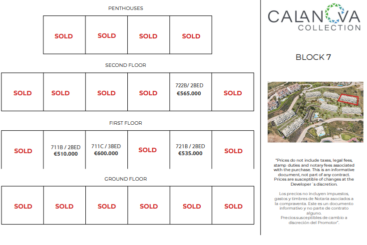 De vermelde prijzen zijn exclusief 10% IVA (btw). Houd daarnaast ook rekening met het zegelrecht (1,2 tot 1,5%) die wordt geheven bij een nieuwbouwwoning. Vergeet ook niet de kosten voor een advocaat, notaris en het overzetten van gas, elektriciteit en water. En, indien nodig, het regelen van NIE-nummers en het openen van een bankrekening. Voor het gemak kun je ervan uitgaan dat de bijkomende kosten ongeveer 14% van de aankoopprijs bedragen.