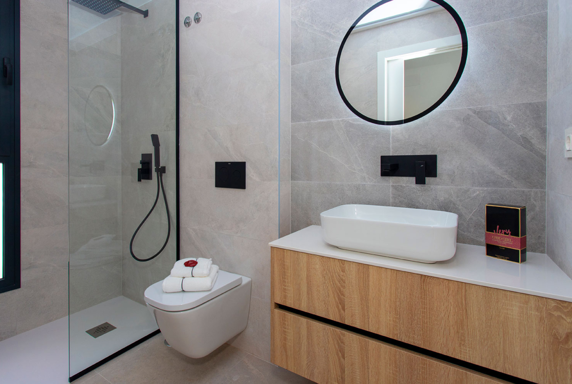 De villa heeft drie ruime slaapkamers, twee luxe badkamers en een buitentoilet bij het zwembad. De hoofdslaapkamer is bijzonder licht, met een en-suite badkamer, een ruime kleedkamer en directe toegang tot het grote terras, waar het prachtige zwembad ligt. Dit is de perfecte plek om te genieten van het mediterrane klimaat.