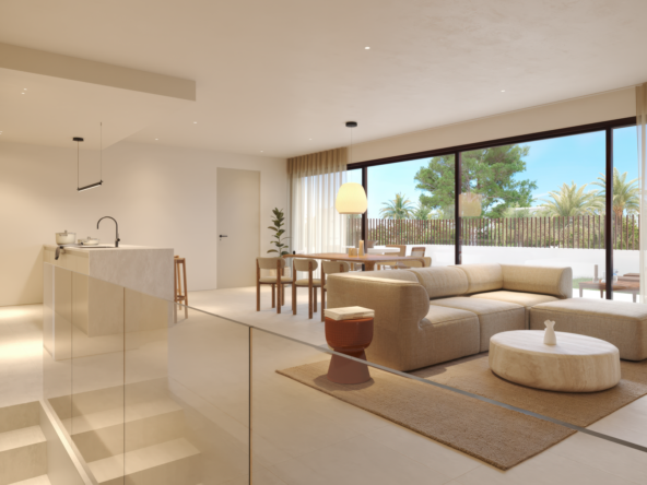 Elke woning is ontworpen om maximaal natuurlijk licht binnen te laten en de verbinding tussen binnen en buiten te versterken. Het hart van de woning is een ruime woon- en eetkamer met een geïntegreerde keuken en ontbijtb ar, met een oppervlakte van meer dan 45 m², die via een indrukwekkende schuifpui van meer dan 8 meter breed toegang geeft tot buiten. Deze opening creëert een doorlopende binnen-buitenruimte van meer dan 80 m², waarin het terras en het privézwembad naadloos worden geïntegreerd in het dagelijks leven.