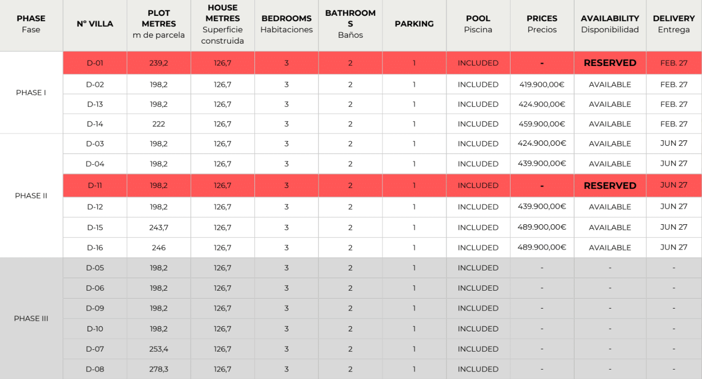 De woningen beschikken over drie tweepersoonsslaapkamers, waaronder een master bedroom met en-suite badkamer en open dressing, evenals een tweede complete badkamer. Elke woning heeft een eigen perceel met een privézwembad en parkeerplaats en biedt de mogelijkheid om een solarium van circa 50 m² toe te voegen, uitgerust voor een barbecuegedeelte en jacuzzi. Het project onderscheidt zich door zijn kwaliteit, energie-efficiëntie en een ontwerp dat gericht is op het hele jaar door genieten van het klimaat en optimaal wooncomfort.
