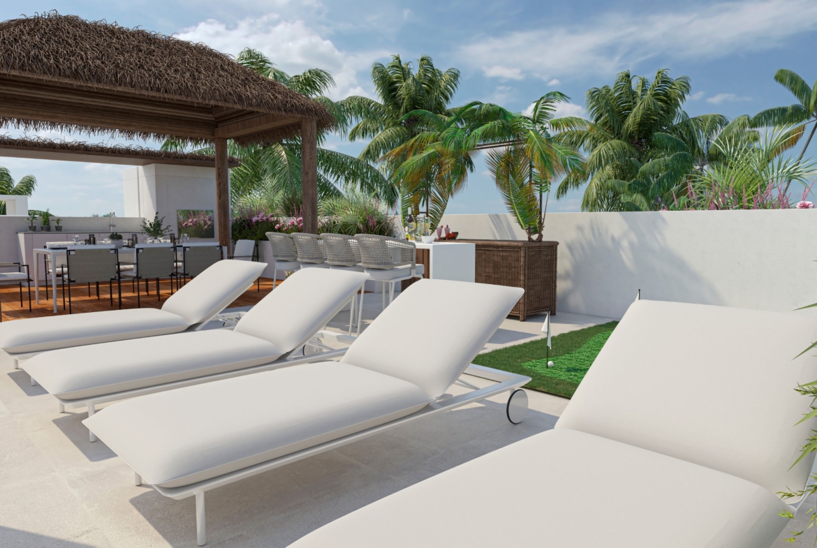 Alle appartementen op de begane grond en de bovenste verdieping hebben een privézwembad. De appartementen op de middelste verdieping zijn allemaal voorbereid op een jacuzzi. Alle appartementen hebben toegang tot het gemeenschappelijke zwembad en de fitnessruimte.