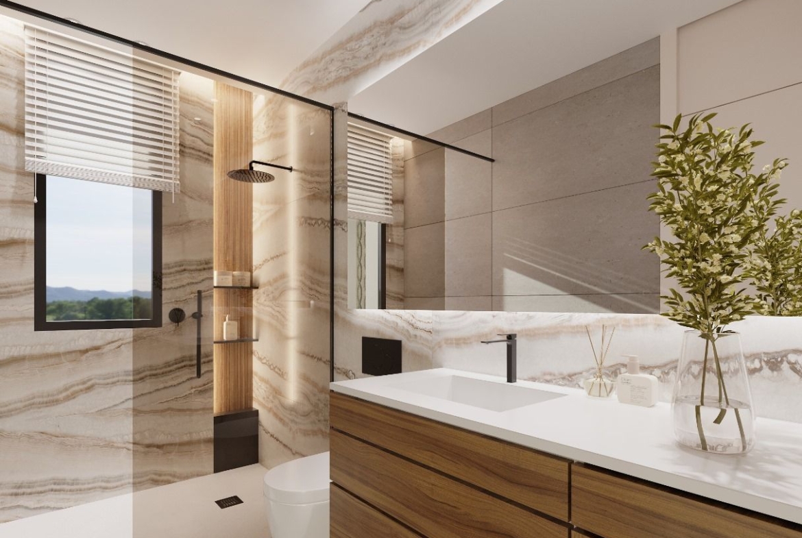 Elke villa beschikt over 3 royale slaapkamers, elk uitgerust met inbouwkasten, en 3 prachtig afgewerkte badkamers die een gevoel van verfijning en comfort uitstralen. De combinatie van binnen- en buitenverlichting benadrukt de moderne architectuur en creëert een sfeervolle ambiance zowel binnen als buiten.