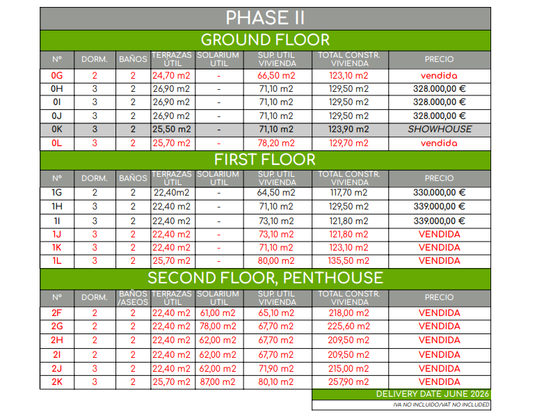 De vermelde prijzen zijn exclusief 10% IVA (btw). Houd daarnaast ook rekening met het zegelrecht (1,2 tot 1,5%) die wordt geheven bij een nieuwbouwwoning. Vergeet ook niet de kosten voor een advocaat, notaris en het overzetten van gas, elektriciteit en water. En, indien nodig, het regelen van NIE-nummers en het openen van een bankrekening. Voor het gemak kun je ervan uitgaan dat de bijkomende kosten ongeveer 14% van de aankoopprijs bedragen.