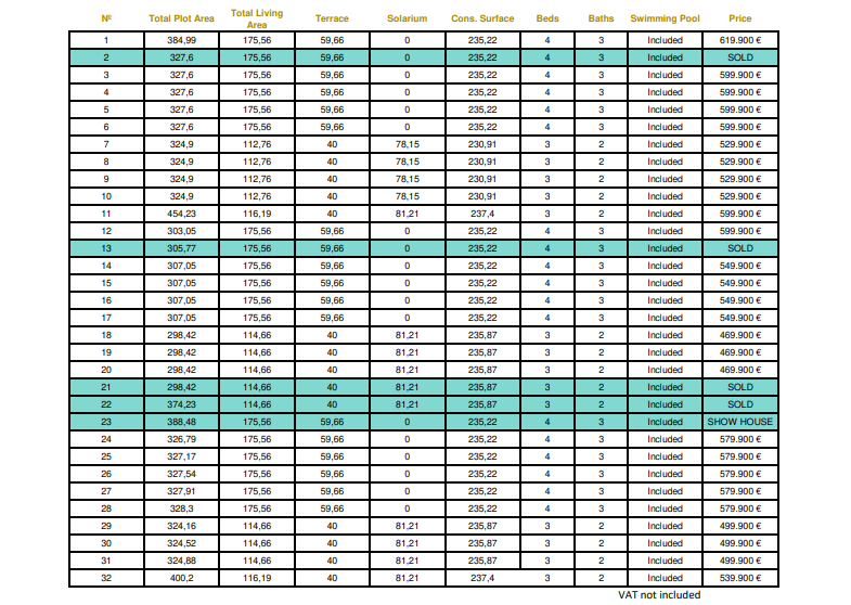 De vermelde prijzen zijn exclusief 10% IVA (btw). Houd daarnaast ook rekening met het zegelrecht (1,2 tot 1,5%) die wordt geheven bij een nieuwbouwwoning. Vergeet ook niet de kosten voor een advocaat, notaris en het overzetten van gas, elektriciteit en water. En, indien nodig, het regelen van NIE-nummers en het openen van een bankrekening. Voor het gemak kun je ervan uitgaan dat de bijkomende kosten ongeveer 14% van de aankoopprijs bedragen.