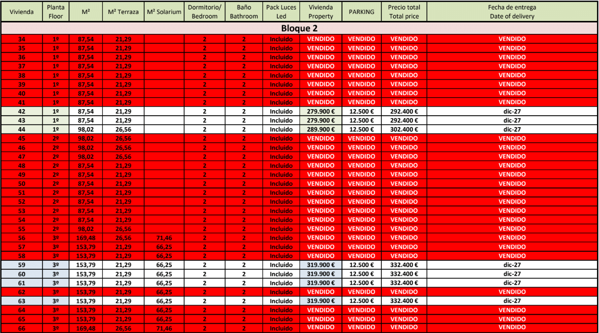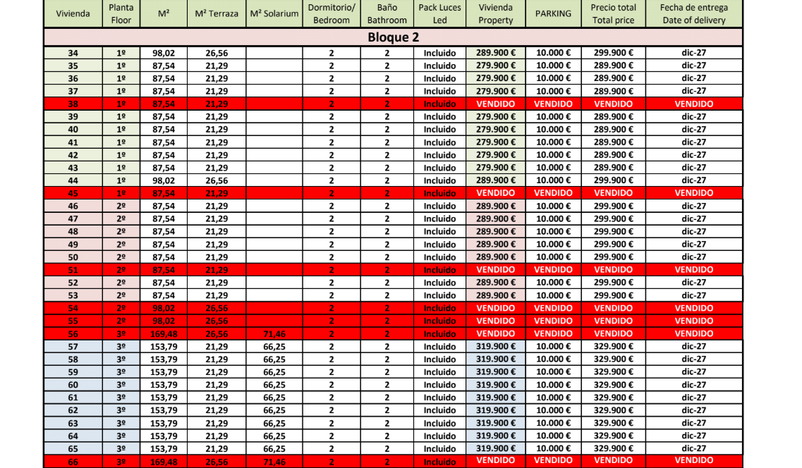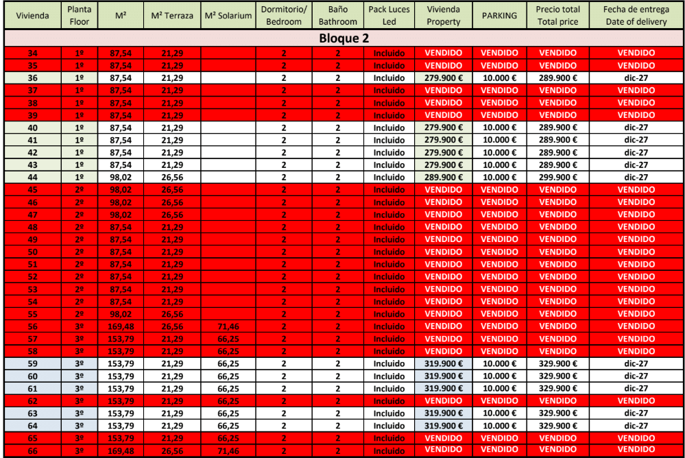 De vermelde prijzen zijn exclusief 10% IVA (btw). Houd daarnaast ook rekening met het zegelrecht (1,2 tot 1,5%) die wordt geheven bij een nieuwbouwwoning. Vergeet ook niet de kosten voor een advocaat, notaris en het overzetten van gas, elektriciteit en water. En, indien nodig, het regelen van NIE-nummers en het openen van een bankrekening. Voor het gemak kun je ervan uitgaan dat de bijkomende kosten ongeveer 14% van de aankoopprijs bedragen.