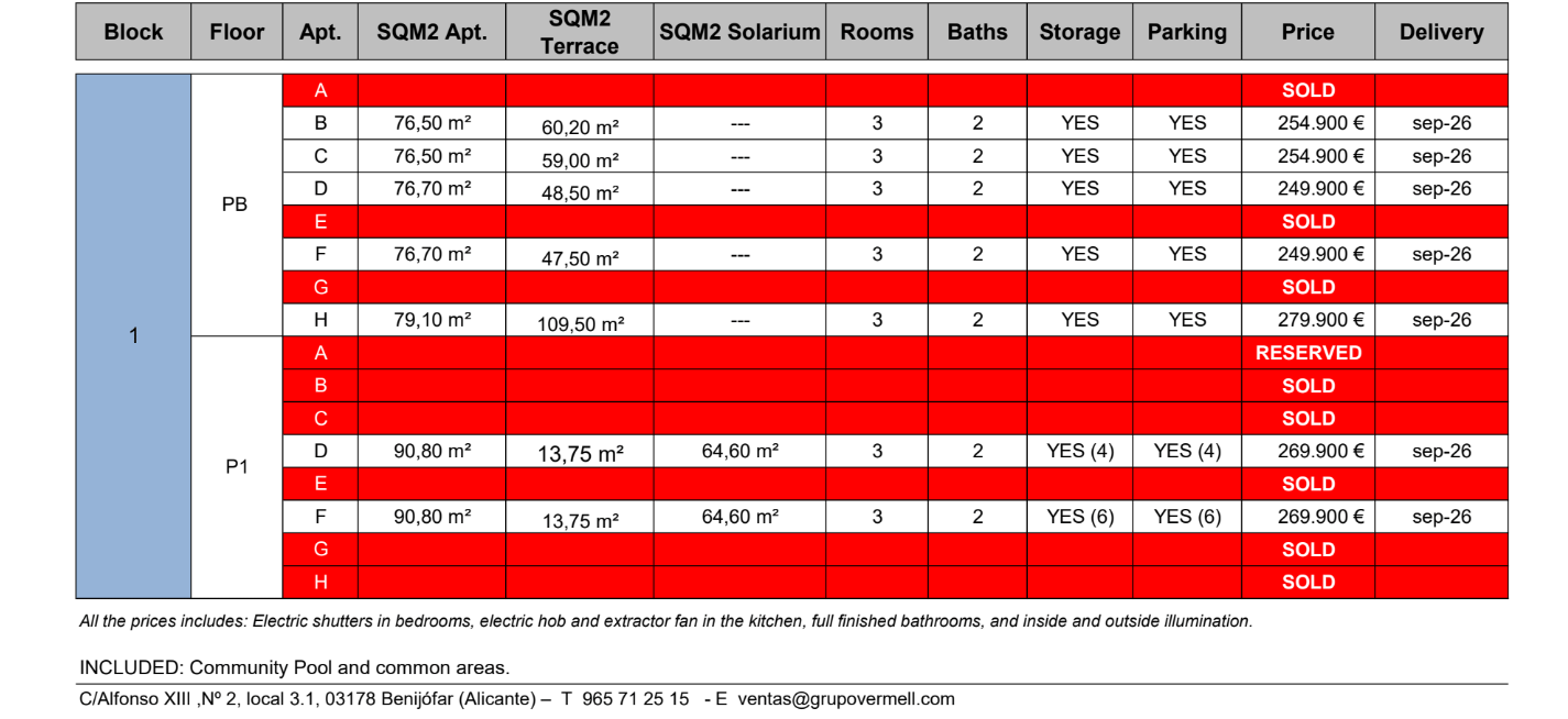 De vermelde prijzen zijn exclusief 10% IVA (btw). Houd daarnaast ook rekening met het zegelrecht (1,2 tot 1,5%) die wordt geheven bij een nieuwbouwwoning. Vergeet ook niet de kosten voor een advocaat, notaris en het overzetten van gas, elektriciteit en water. En, indien nodig, het regelen van NIE-nummers en het openen van een bankrekening. Voor het gemak kun je ervan uitgaan dat de bijkomende kosten ongeveer 14% van de aankoopprijs bedragen.
