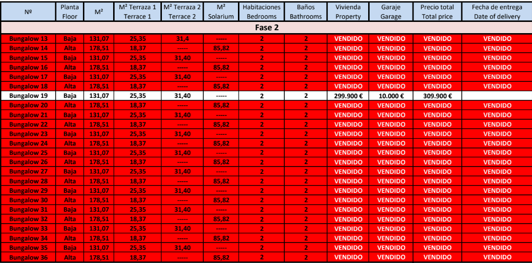 De woningen zelf variëren in grootte, met vloeroppervlakken van meer dan 131 m². Elke woning heeft een ruime woonkamer, een open keuken, twee royale slaapkamers en twee moderne badkamers. Kies voor een bungalow op de begane grond met twee grote privéterrassen, ideaal om te ontspannen en te genieten van het milde mediterrane klimaat. Of kies voor een bungalow op de tweede verdieping, die niet alleen een woonoppervlakte van 178 m² biedt, maar ook een solarium van 85 m², perfect voor een panoramisch uitzicht op de Laguna Rosa en de Middellandse Zee.