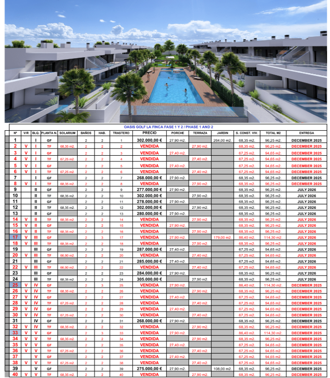Oasis Golf ligt in het rustige en pittoreske Algorfa, een charmant stadje aan de Costa Blanca. Algorfa staat bekend om zijn prachtige natuur en de nabijheid van de bergen en biedt de perfecte balans tussen ontspanning en toegang tot voorzieningen. Naast de prestigieuze golfbaan La Finca zijn er restaurants, bars en winkels in de buurt, evenals het historische dorpscentrum waar de Spaanse charme en cultuur voelbaar zijn. De gouden stranden van Guardamar del Segura liggen op korte rijafstand, terwijl steden als Torrevieja en Orihuela een breed scala aan recreatieve mogelijkheden bieden. Met uitstekende wegverbindingen naar Alicante en Murcia is dit de ideale plek voor wie op zoek is naar een luxe, serene woonomgeving die tegelijkertijd verbonden is met het bruisende hart van de Costa Blanca.