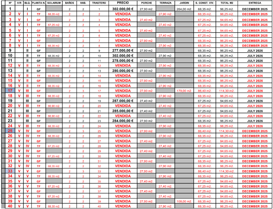 De vermelde prijzen zijn exclusief 10% IVA (btw). Houd daarnaast ook rekening met het zegelrecht (1,2 tot 1,5%) die wordt geheven bij een nieuwbouwwoning. Vergeet ook niet de kosten voor een advocaat, notaris en het overzetten van gas, elektriciteit en water. En, indien nodig, het regelen van NIE-nummers en het openen van een bankrekening. Voor het gemak kun je ervan uitgaan dat de bijkomende kosten ongeveer 14% van de aankoopprijs bedragen.