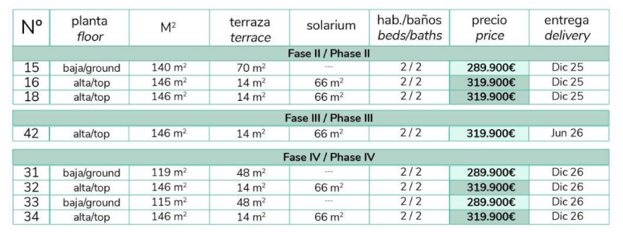 De vermelde prijzen zijn exclusief 10% IVA (btw). Houd daarnaast ook rekening met het zegelrecht (1,2 tot 1,5%) die wordt geheven bij een nieuwbouwwoning. Vergeet ook niet de kosten voor een advocaat, notaris en het overzetten van gas, elektriciteit en water. En, indien nodig, het regelen van NIE-nummers en het openen van een bankrekening. Voor het gemak kun je ervan uitgaan dat de bijkomende kosten ongeveer 14% van de aankoopprijs bedragen.