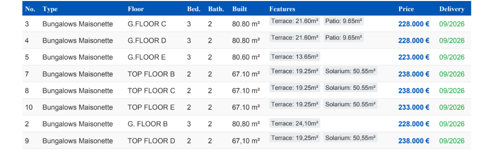 Alle woningen hebben een open plan woonkamer. De keuken is voorzien van alle apperatuur. iede unit heeft 2 of 3 slaapkamers, allemaal met ingebouwde kasten en 2 volledig ingerichte badkamers met wastafel, spiegel en licht, regendouche en verschuifbare doucheschermen. Het lichtplan is inclusief LED binnenverlichting en LED buitenverlichting. En er komt een fotovoltaïsche zonne-installatie op het dak. De appartementen hebben een terras op de begane grond en de penthouses hebben een solarium met zomerkeuken.