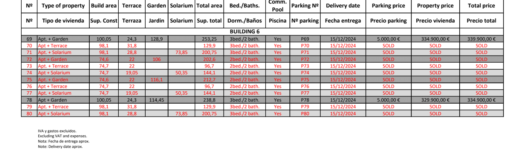 De vermelde prijzen zijn exclusief 10% IVA (btw). Houd daarnaast ook rekening met het zegelrecht (1,2 tot 1,5%) die wordt geheven bij een nieuwbouwwoning. Vergeet ook niet de kosten voor een advocaat, notaris en het overzetten van gas, elektriciteit en water. En, indien nodig, het regelen van NIE-nummers en het openen van een bankrekening. Voor het gemak kun je ervan uitgaan dat de bijkomende kosten ongeveer 14% van de aankoopprijs bedragen.