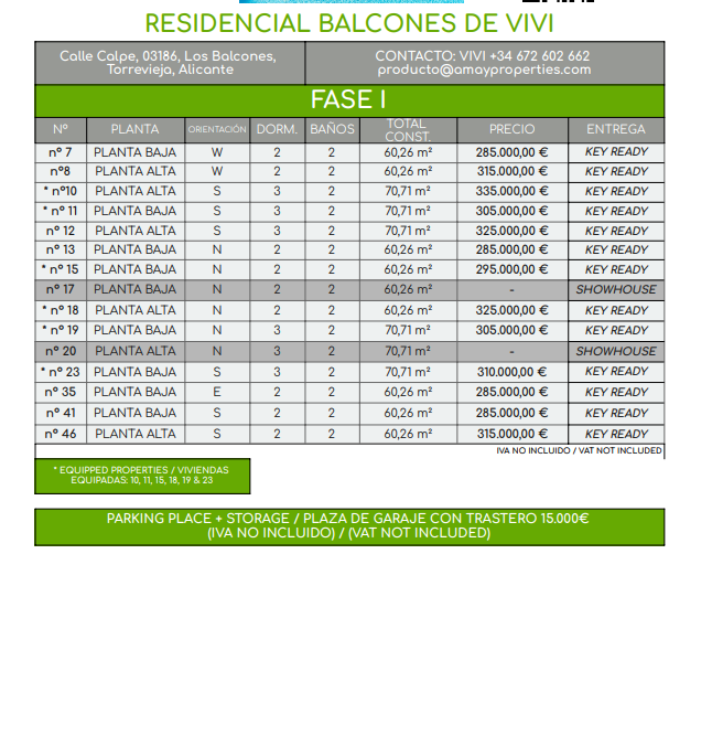 De vermelde prijzen zijn exclusief 10% IVA (btw). Houd daarnaast ook rekening met het zegelrecht (1,2 tot 1,5%) die wordt geheven bij een nieuwbouwwoning. Vergeet ook niet de kosten voor een advocaat, notaris en het overzetten van gas, elektriciteit en water. En, indien nodig, het regelen van NIE-nummers en het openen van een bankrekening. Voor het gemak kun je ervan uitgaan dat de bijkomende kosten ongeveer 14% van de aankoopprijs bedragen.