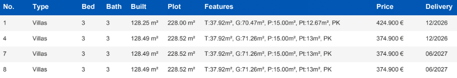 Elke villa beschikt over drie ruime slaapkamers en drie volledig uitgeruste badkamers, verdeeld over twee niveaus. Het ontwerp volgt een eigentijdse stijl met een open indeling, waarbij de woonkamer-eetkamer en de volledig ingerichte keuken naadloos in elkaar overgaan, wat zorgt voor een lichte en luchtige sfeer. De villa’s zijn perfect voor het moderne gezinsleven, met ruime kamers en hoogwaardige afwerkingen.