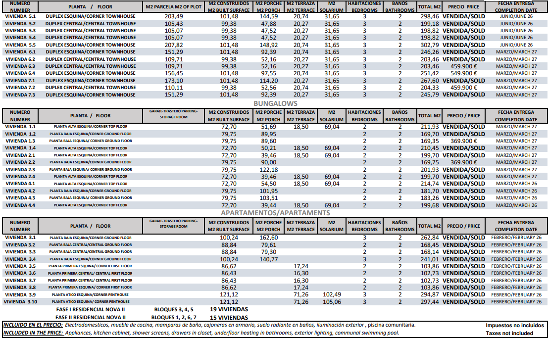 De vermelde prijzen zijn exclusief 10% IVA (btw). Houd daarnaast ook rekening met het zegelrecht (1,2 tot 1,5%) die wordt geheven bij een nieuwbouwwoning. Vergeet ook niet de kosten voor een advocaat, notaris en het overzetten van gas, elektriciteit en water. En, indien nodig, het regelen van NIE-nummers en het openen van een bankrekening. Voor het gemak kun je ervan uitgaan dat de bijkomende kosten ongeveer 14% van de aankoopprijs bedragen.