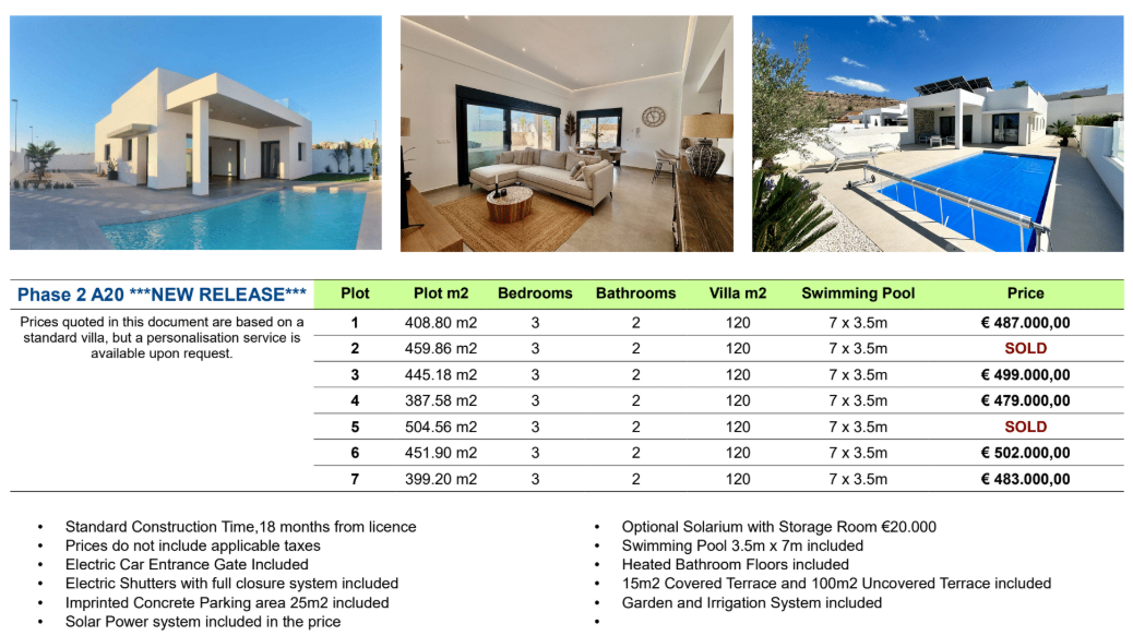 De vermelde prijzen zijn exclusief 10% IVA (btw). Houd daarnaast ook rekening met het zegelrecht (1,2 tot 1,5%) die wordt geheven bij een nieuwbouwwoning. Vergeet ook niet de kosten voor een advocaat, notaris en het overzetten van gas, elektriciteit en water. En, indien nodig, het regelen van NIE-nummers en het openen van een bankrekening. Voor het gemak kun je ervan uitgaan dat de bijkomende kosten ongeveer 14% van de aankoopprijs bedragen.