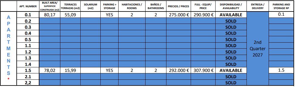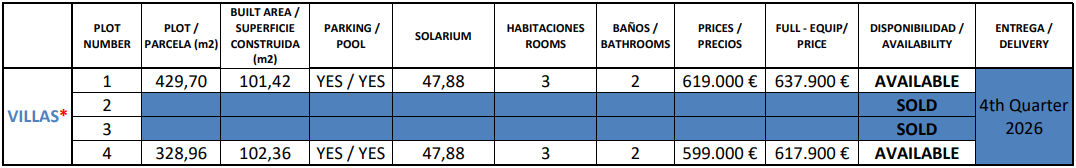 De vermelde prijzen zijn exclusief 10% IVA (btw). Houd daarnaast ook rekening met het zegelrecht (1,2 tot 1,5%) die wordt geheven bij een nieuwbouwwoning. Vergeet ook niet de kosten voor een advocaat, notaris en het overzetten van gas, elektriciteit en water. En, indien nodig, het regelen van NIE-nummers en het openen van een bankrekening. Voor het gemak kun je ervan uitgaan dat de bijkomende kosten ongeveer 14% van de aankoopprijs bedragen.