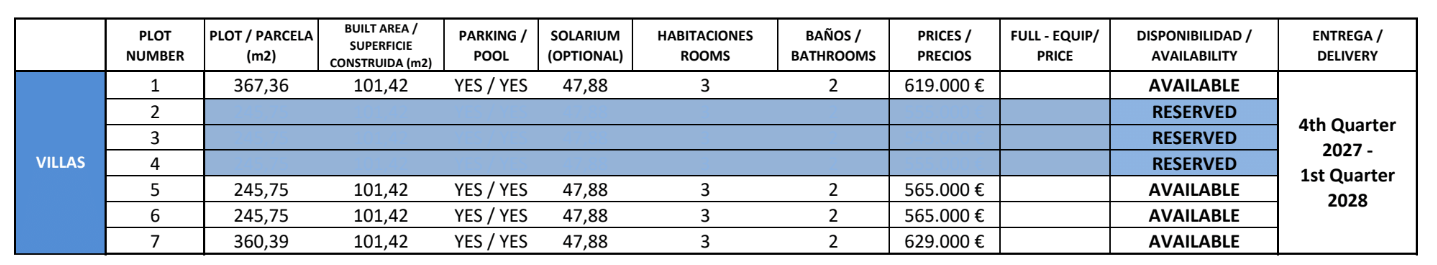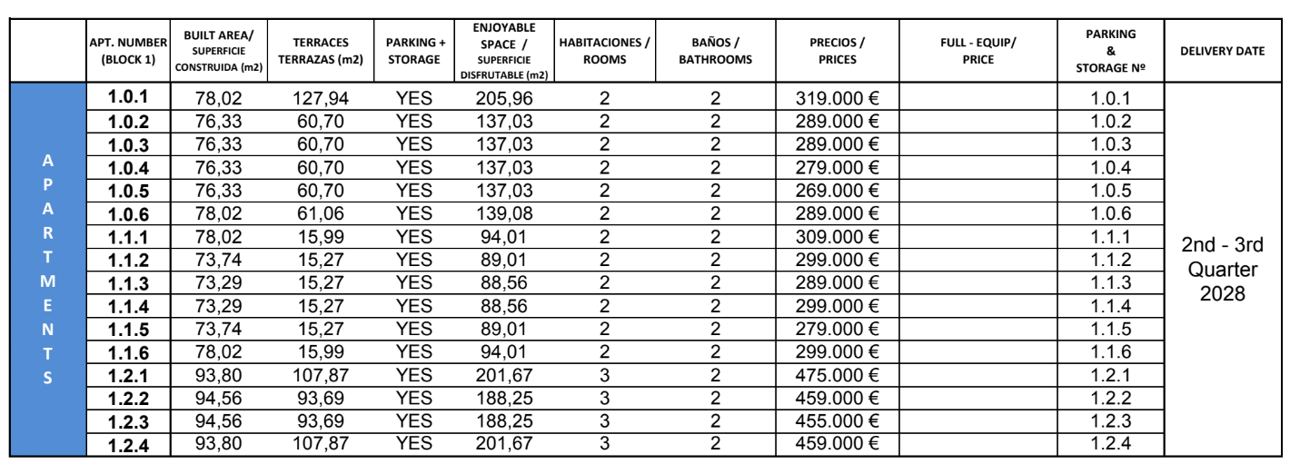 De vermelde prijzen zijn exclusief 10% IVA (btw). Houd daarnaast ook rekening met het zegelrecht (1,2 tot 1,5%) die wordt geheven bij een nieuwbouwwoning. Vergeet ook niet de kosten voor een advocaat, notaris en het overzetten van gas, elektriciteit en water. En, indien nodig, het regelen van NIE-nummers en het openen van een bankrekening. Voor het gemak kun je ervan uitgaan dat de bijkomende kosten ongeveer 14% van de aankoopprijs bedragen.