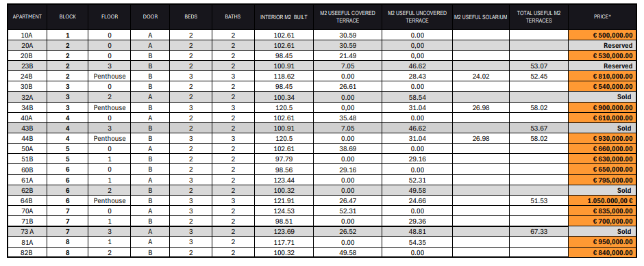 De vermelde prijzen zijn exclusief 10% IVA (btw). Houd daarnaast ook rekening met het zegelrecht (1,2 tot 1,5%) die wordt geheven bij een nieuwbouwwoning. Vergeet ook niet de kosten voor een advocaat, notaris en het overzetten van gas, elektriciteit en water. En, indien nodig, het regelen van NIE-nummers en het openen van een bankrekening. Voor het gemak kun je ervan uitgaan dat de bijkomende kosten ongeveer 14% van de aankoopprijs bedragen.