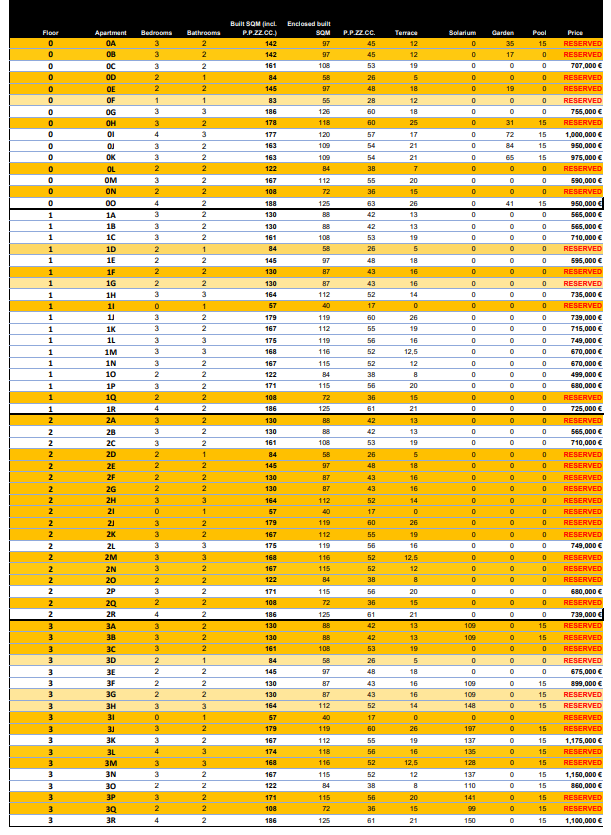 De vermelde prijzen zijn exclusief 10% IVA (btw). Houd daarnaast ook rekening met het zegelrecht (1,2 tot 1,5%) die wordt geheven bij een nieuwbouwwoning. Vergeet ook niet de kosten voor een advocaat, notaris en het overzetten van gas, elektriciteit en water. En, indien nodig, het regelen van NIE-nummers en het openen van een bankrekening. Voor het gemak kun je ervan uitgaan dat de bijkomende kosten ongeveer 14% van de aankoopprijs bedragen.