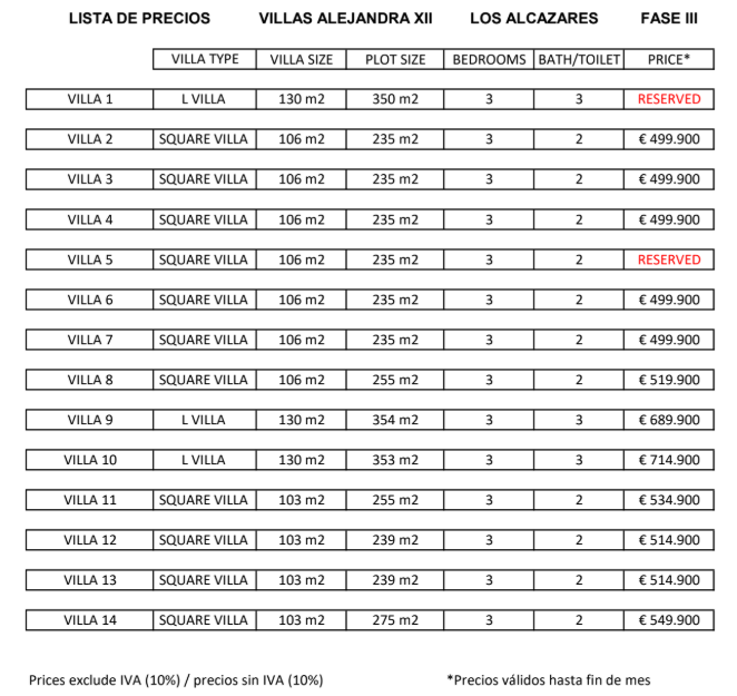 De vermelde prijzen zijn exclusief 10% IVA (btw). Houd daarnaast ook rekening met het zegelrecht (1,2 tot 1,5%) die wordt geheven bij een nieuwbouwwoning. Vergeet ook niet de kosten voor een advocaat, notaris en het overzetten van gas, elektriciteit en water. En, indien nodig, het regelen van NIE-nummers en het openen van een bankrekening. Voor het gemak kun je ervan uitgaan dat de bijkomende kosten ongeveer 14% van de aankoopprijs bedragen.