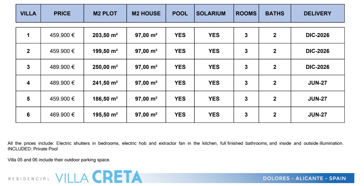 Villa Creta ligt in Dolores (Alicante), in een bevoorrechte omgeving aan de Costa Blanca, direct naast het natuurpark El Hondo. De residentie wordt omringd door natuur en beschikt tegelijkertijd over alle noodzakelijke voorzieningen in de nabije omgeving. De ligging is ideaal: op slechts 25 minuten van de luchthaven van Alicante, dichtbij de prachtige stranden van Guardamar del Segura en op enkele minuten van de belangrijkste golfbanen in de regio. Deze uitstekende locatie maakt het project perfect voor wie op zoek is naar rust en comfort.