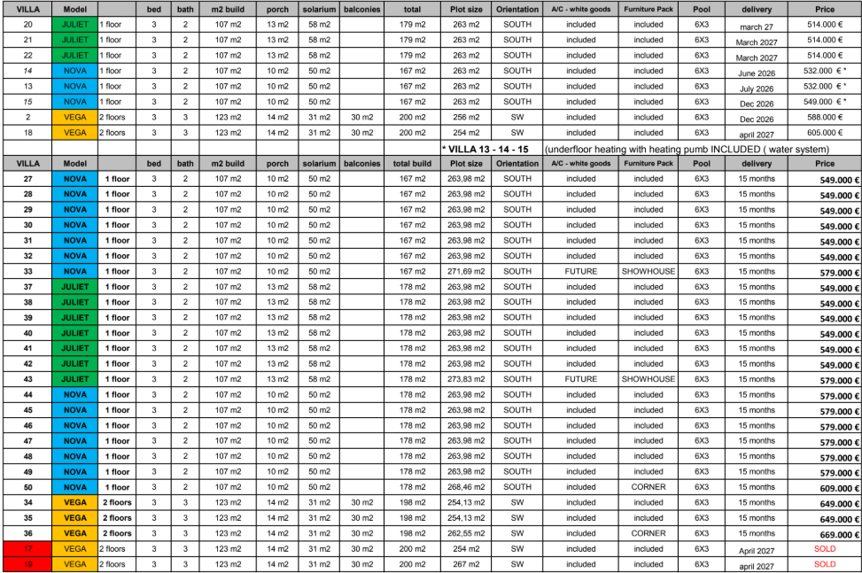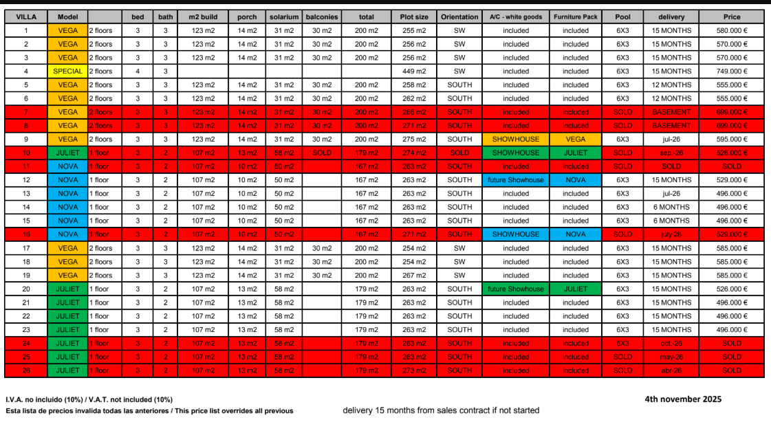 De vermelde prijzen zijn exclusief 10% IVA (btw). Houd daarnaast ook rekening met het zegelrecht (1,2 tot 1,5%) die wordt geheven bij een nieuwbouwwoning. Vergeet ook niet de kosten voor een advocaat, notaris en het overzetten van gas, elektriciteit en water. En, indien nodig, het regelen van NIE-nummers en het openen van een bankrekening. Voor het gemak kun je ervan uitgaan dat de bijkomende kosten ongeveer 14% van de aankoopprijs bedragen.