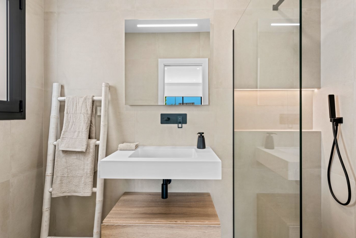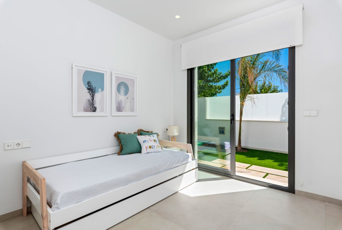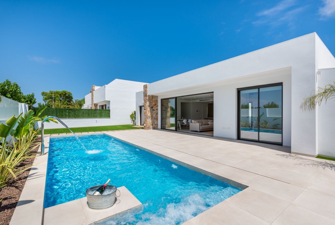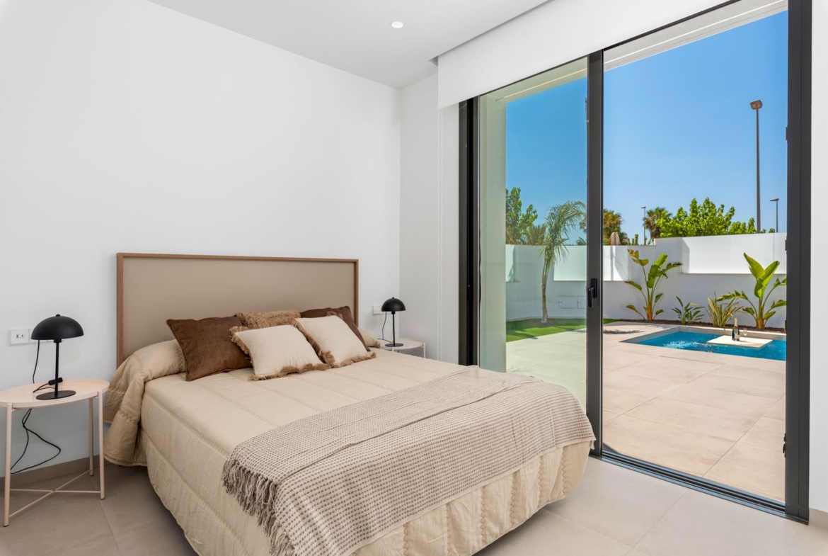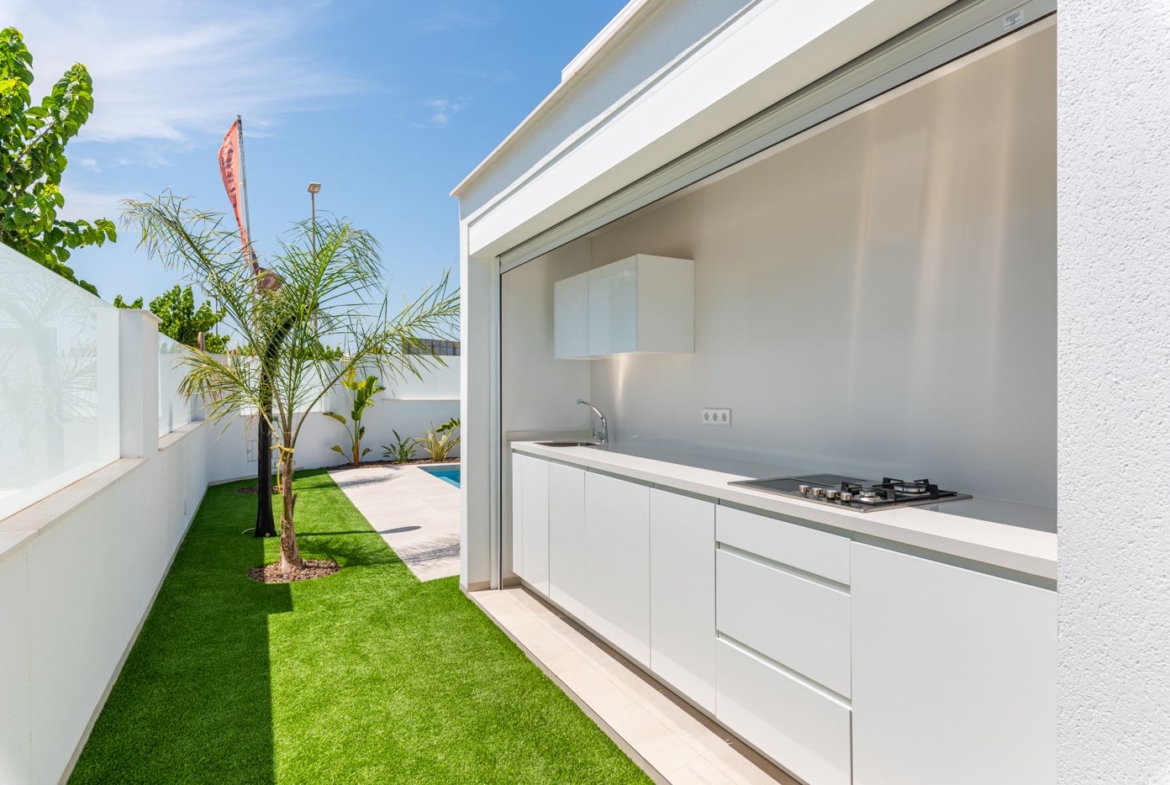 Villa Alejandra XII (N) ligt in het zonnige Los Alcázares, aan de prachtige Costa Cálida in de regio Murcia, Spanje. Deze luxe villa's bieden een unieke kans om te genieten van comfortabel en stijlvol wonen in een van de mooiste delen van Spanje. Elke woning is volledig gelijkvloers en beschikt over drie ruime slaapkamers en drie moderne badkamers, waarbij de hoofdslaapkamer een eigen badkamer heeft voor extra privacy en comfort. De villa is ontworpen met een open en lichte indeling, waarbij de moderne keuken, uitgerust met een handige ontbijtbar, naadloos overloopt in de ruime woon- en eetkamer. Deze open ruimte biedt een ontspannen sfeer en leidt direct naar de grote, betegelde tuin, compleet met een privézwembad voor ultiem comfort en ontspanning.
