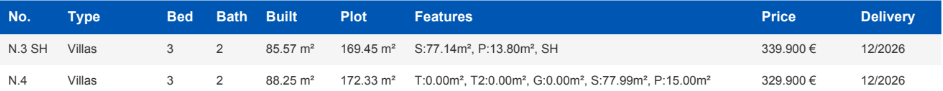 Elke villa beschikt over drie ruime slaapkamers en twee stijlvolle badkamers. De open en lichte woonkamer is verbonden met een volledig uitgeruste keuken, voorzien van topkwaliteit elektrische apparaten. Buiten geniet u van een privézwembad met een elegante waterval, en een groot terras met een buitenkeuken, perfect voor het genieten van het mediterrane klimaat.