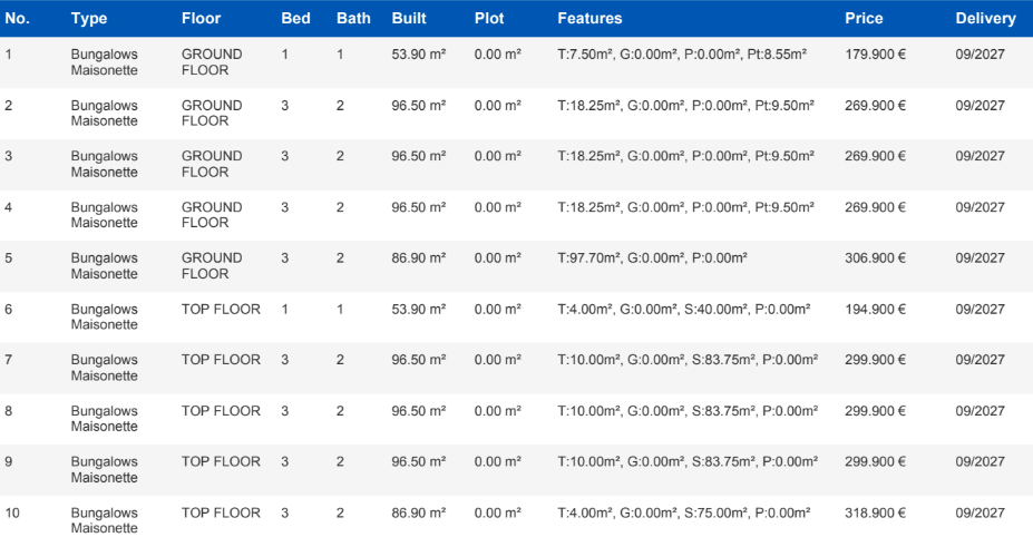 De vermelde prijzen zijn exclusief 10% IVA (btw). Houd daarnaast ook rekening met het zegelrecht (1,2 tot 1,5%) die wordt geheven bij een nieuwbouwwoning. Vergeet ook niet de kosten voor een advocaat, notaris en het overzetten van gas, elektriciteit en water. En, indien nodig, het regelen van NIE-nummers en het openen van een bankrekening. Voor het gemak kun je ervan uitgaan dat de bijkomende kosten ongeveer 14% van de aankoopprijs bedragen.