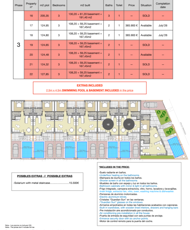 The prices listed are excluding 10% IVA (VAT). You should also take into account the stamp duty (1,2 to 1,5%) that is charged on a new property. Also keep in mind the costs of a lawyer, notary and the transfer of gas, electricity and water. And, if necessary, arranging NIE numbers and opening a bank account. For convenience, you can calculate that the cost on top of the purchase price is around 14%.