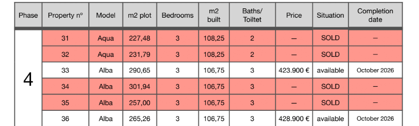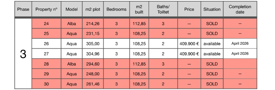 Alba Salina III offers a range of stylish homes ranging from spacious villas to semi-detached homes, all designed with attention to detail and high-quality finishes. The villas feature 3 bedrooms and 2 bathrooms, with an open and modern layout, large windows that let in plenty of natural light, and a private pool. Each house has a spacious garden and private parking, and the finishes are top quality, ensuring comfort and luxury in every room.