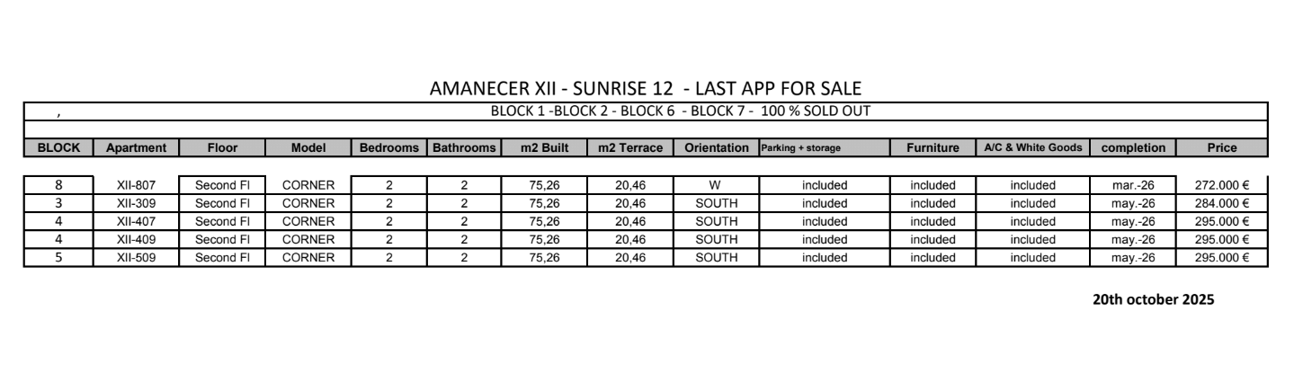 The prices listed are excluding 10% IVA (VAT). You should also take into account the stamp duty (1,2 to 1,5%) that is charged on a new property. Also keep in mind the costs of a lawyer, notary and the transfer of gas, electricity and water. And, if necessary, arranging NIE numbers and opening a bank account. For convenience, you can calculate that the cost on top of the purchase price is around 14%.