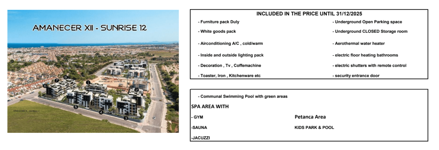 What makes the location of Amanecer XII so attractive is its proximity to both amenities and recreational opportunities. Just a five-minute walk away you can reach a supermarket, a bus stop and a green park, making daily life extremely practical. For beach lovers, the nearest beach is just a five-minute drive away, where you can enjoy the sun and the sea. The famous Villamartin Golf, one of the most beautiful golf courses in the region, is also just a five-minute drive away, making this complex ideal for golfers. Furthermore, the large shopping center La Zenia is just a ten-minute drive away, where you can enjoy a wide range of stores, restaurants and entertainment.