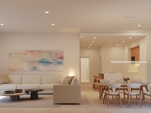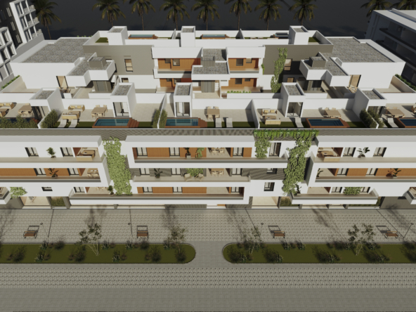 All apartments are exterior-facing, with an average bedroom size of 14 m² and a living-dining room with kitchen of approximately 45 m², designed with two clearly defined zones for optimal family comfort. Terraces range from 11 to 54 m², excluding the duplexes. Each apartment includes a private storage room and a parking space.