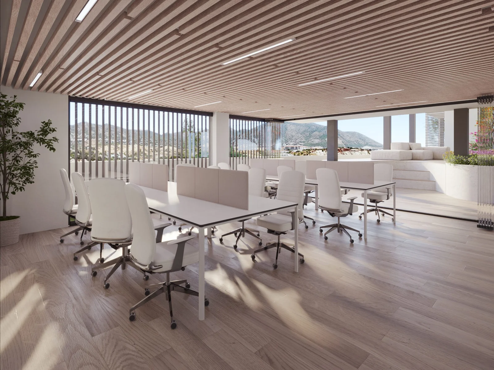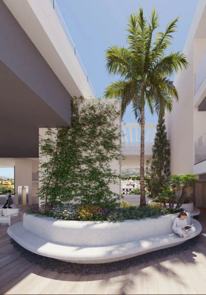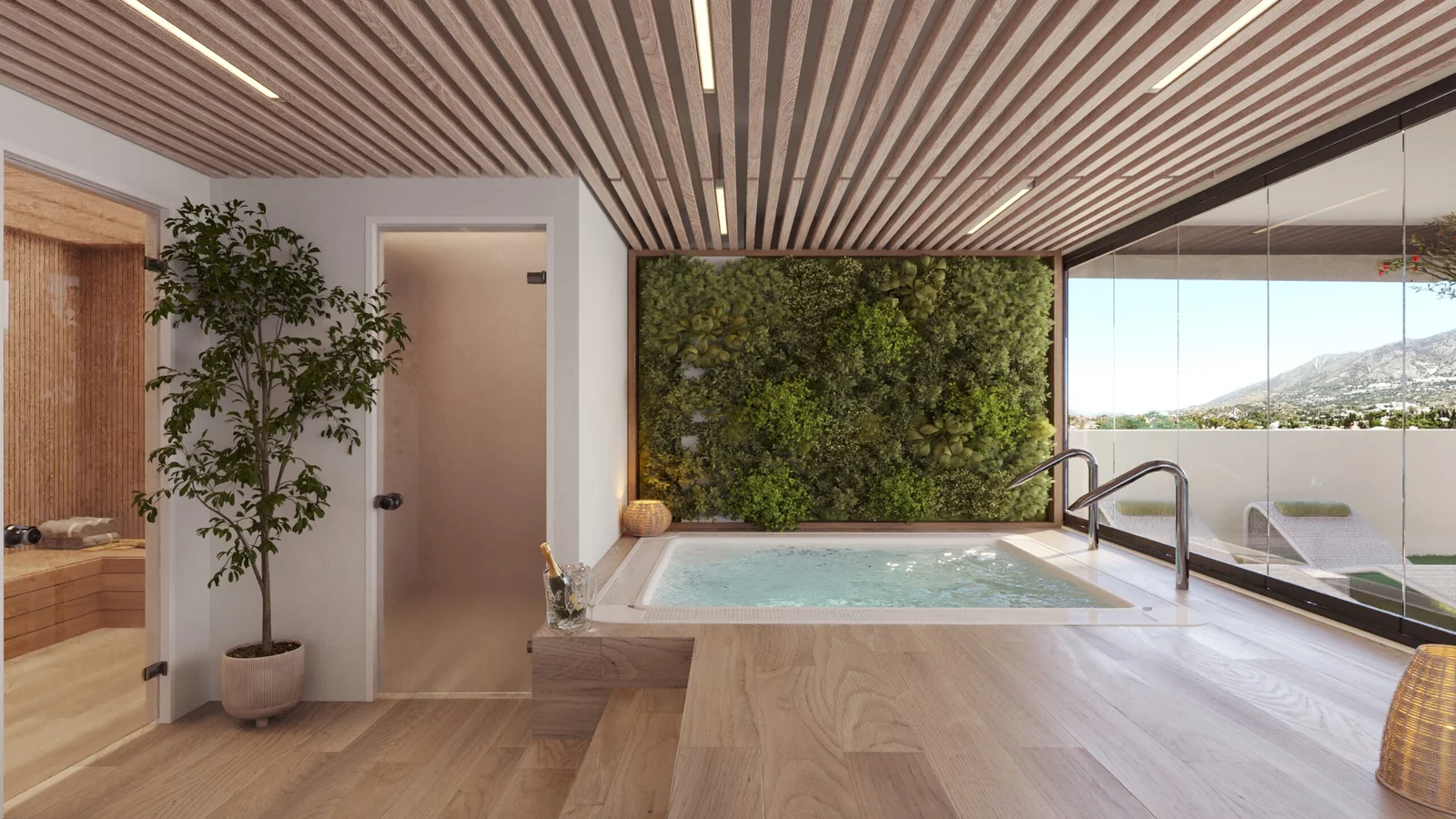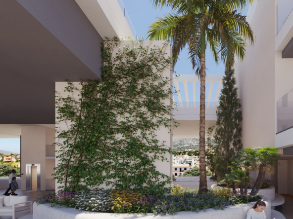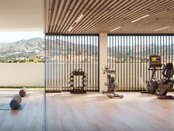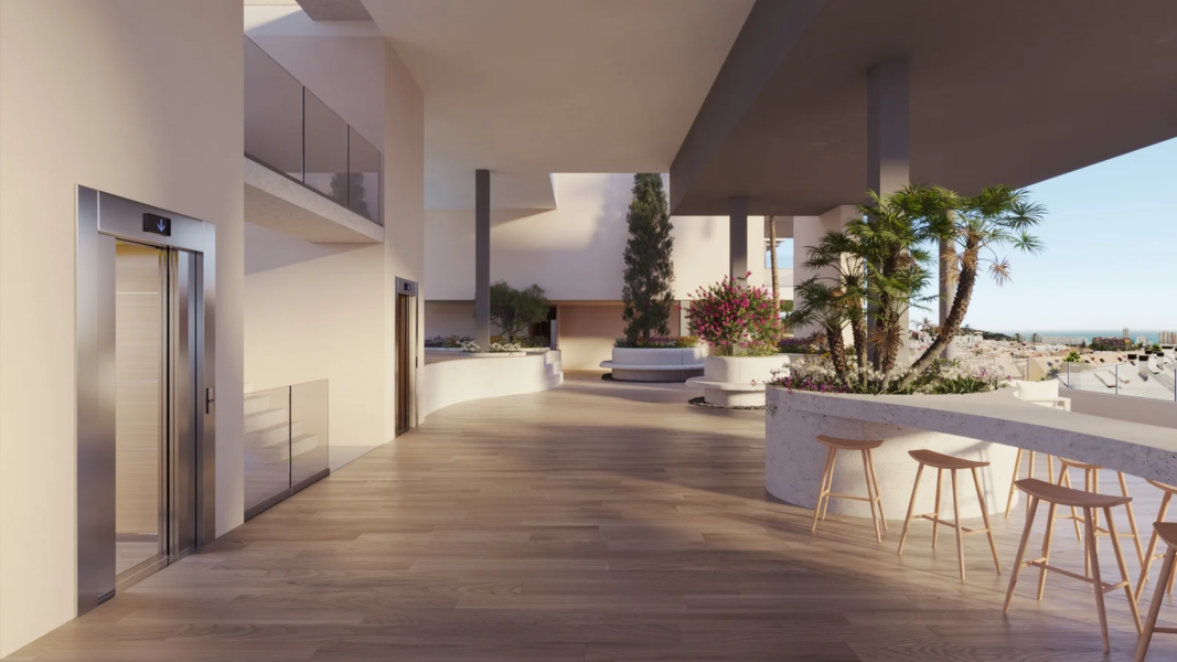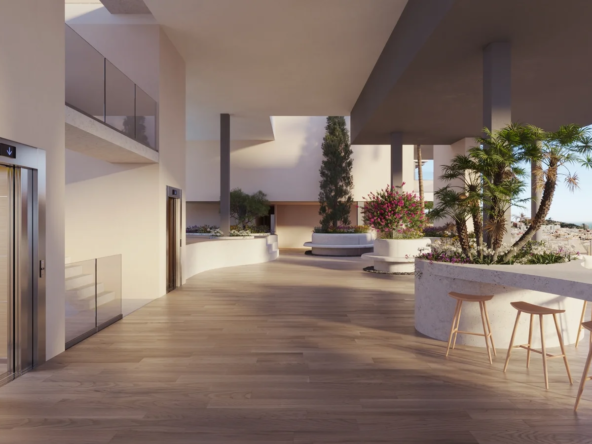 Additional amenities are designed for well-being, work, and leisure, including green lounge areas with views of the Sierra de Mijas, a modern coworking space with plenty of natural light and high-speed Wi-Fi, a wellness area with spa and sauna, a fully equipped gym, and a private cinema. The absolute highlight is located on the top floor: a spectacular sky-infinity pool that visually merges with the Mediterranean Sea, complemented by a stylish chill-out lounge ideal for enjoying sunsets and relaxed evenings.