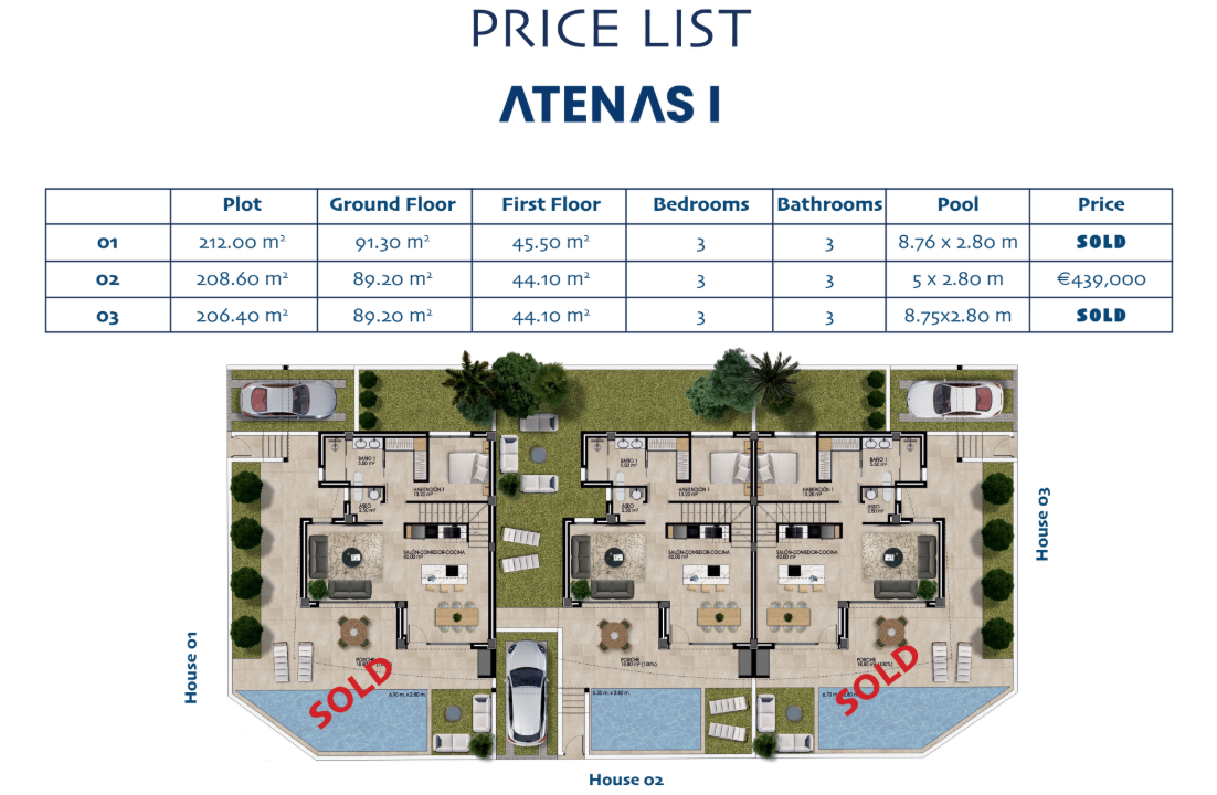 These beautiful homes have two floors and feature three spacious bedrooms and three fully equipped bathrooms. The contemporary architecture and high-quality finishes have been carefully designed to create a sense of luxury, space, and well-being. Large windows provide plenty of natural light and seamlessly connect the interior with the outdoor environment.