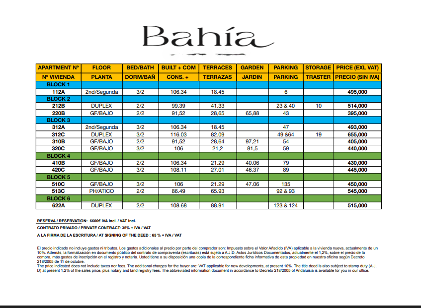 The prices listed are excluding 10% IVA (VAT). You should also take into account the stamp duty (1,2 to 1,5%) that is charged on a new property. Also keep in mind the costs of a lawyer, notary and the transfer of gas, electricity and water. And, if necessary, arranging NIE numbers and opening a bank account. For convenience, you can calculate that the cost on top of the purchase price is around 14%.