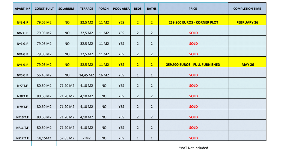 The prices listed are excluding 10% IVA (VAT). You should also take into account the stamp duty (1,2 to 1,5%) that is charged on a new property. Also keep in mind the costs of a lawyer, notary and the transfer of gas, electricity and water. And, if necessary, arranging NIE numbers and opening a bank account. For convenience, you can calculate that the cost on top of the purchase price is around 14%.