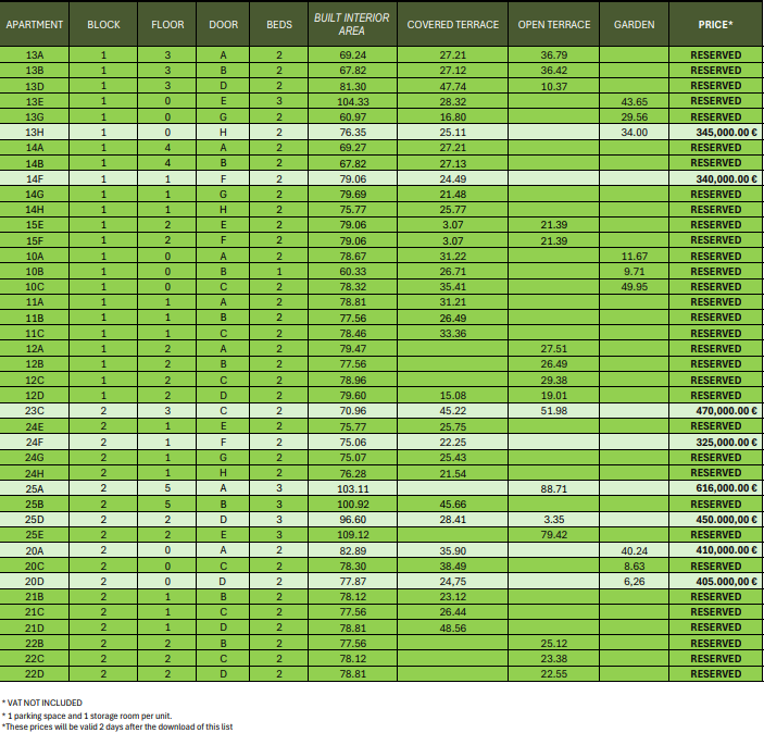 The prices listed are excluding 10% IVA (VAT). You should also take into account the stamp duty (1,2 to 1,5%) that is charged on a new property. Also keep in mind the costs of a lawyer, notary and the transfer of gas, electricity and water. And, if necessary, arranging NIE numbers and opening a bank account. For convenience, you can calculate that the cost on top of the purchase price is around 14%.