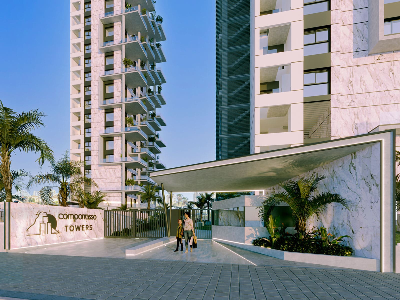 Camporrosso Towers combines elegance, sustainability, and quality in every detail: expansive landscaped areas, a coworking space, swimming pool, gym, padel courts, relaxation areas, and social spaces that invite you to share, unwind, and celebrate life.