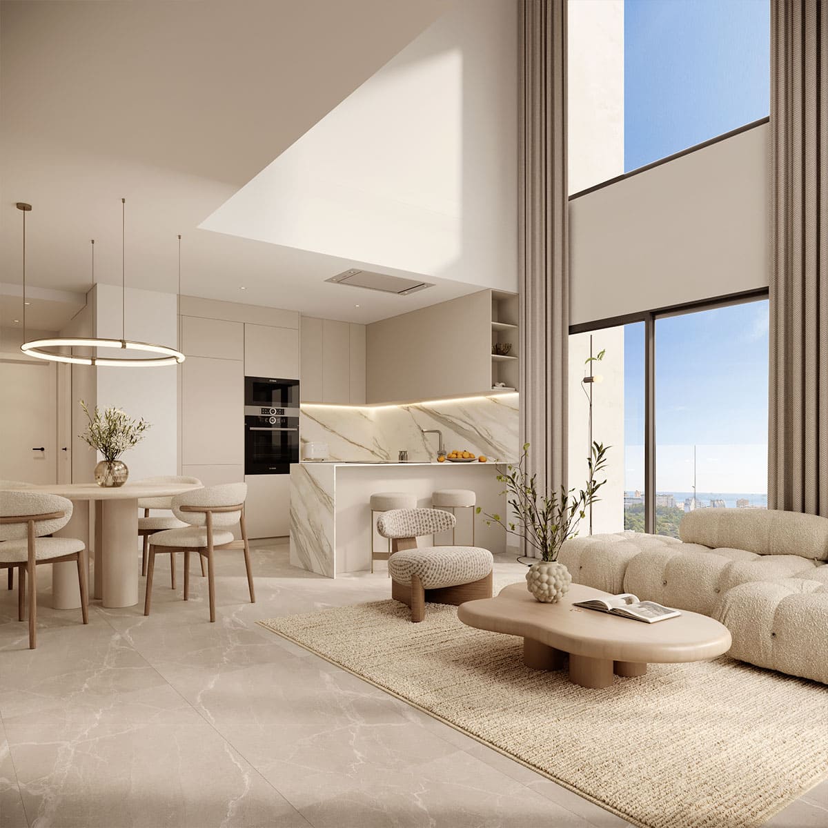 The slender, bright towers house apartments with clean lines and terraces that open toward the horizon, offering unparalleled views of the sea, the lagoon, and the mountains that embrace the Costa Blanca.