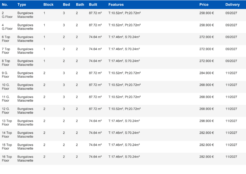 The development offers two types of homes: ground-floor bungalows and top-floor properties. The ground-floor homes provide the convenience of single-level living and feature two private gardens, allowing the interior spaces to extend naturally outdoors. The top-floor homes stand out with spacious terraces offering plenty of sunshine and enhanced privacy, perfect for enjoying outdoor living throughout the year.