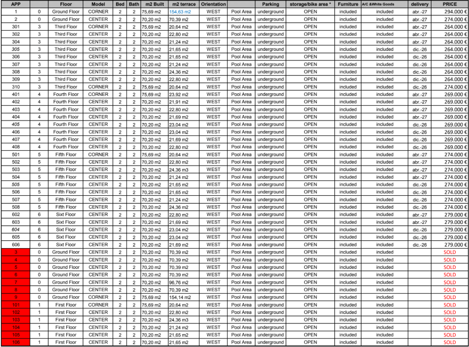 Duly consists of 110 apartments divided into two phases. Phase 1 includes 68 apartments and will be the first to go on the market. Although official sales will not begin until May 2025, interested parties can take advantage of an exclusive pre-sale as early as April 10. Prices start from €219,000 for a 2-bedroom apartment. The penthouses, of which only six are available, start from €289,000.