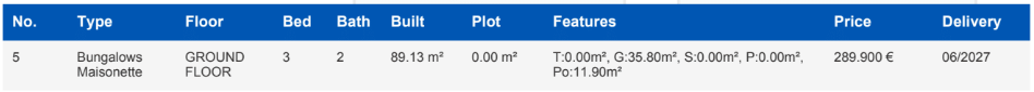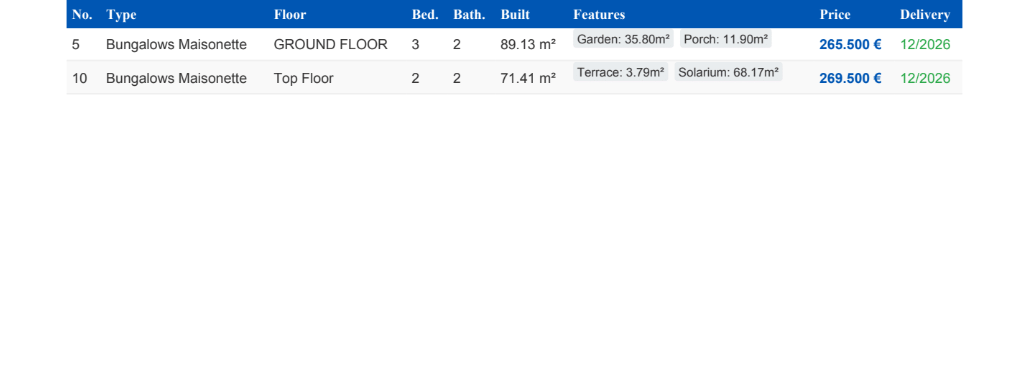 This residential complex consists of 16 modern bungalows, with properties of 2 or 3 bedrooms and 2 bathrooms, perfectly combining comfort and style. The interiors are elegantly and functionally furnished, with fully equipped kitchens, including white goods, and a preliminary installation for air conditioning ducts, so you can enjoy optimal comfort all year round.