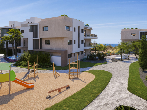 The complex includes 184 homes: apartments and penthouses with 2, 3, or 4 bedrooms, and semi-detached villas with 3 bedrooms, divided into several blocks with various amenities. The communal areas provide everything for comfortable living, such as a heated infinity pool with sea views, summer pool, childrenโs pool, kidsโ play area with water jets, hot tubs, and poolside terraces. For sports and relaxation, there is a gym, spa, co-working room, and multipurpose room. The complex is designed with landscaped green areas, pathways to the pools, an on-site store, and a security checkpoint at the main entrance.