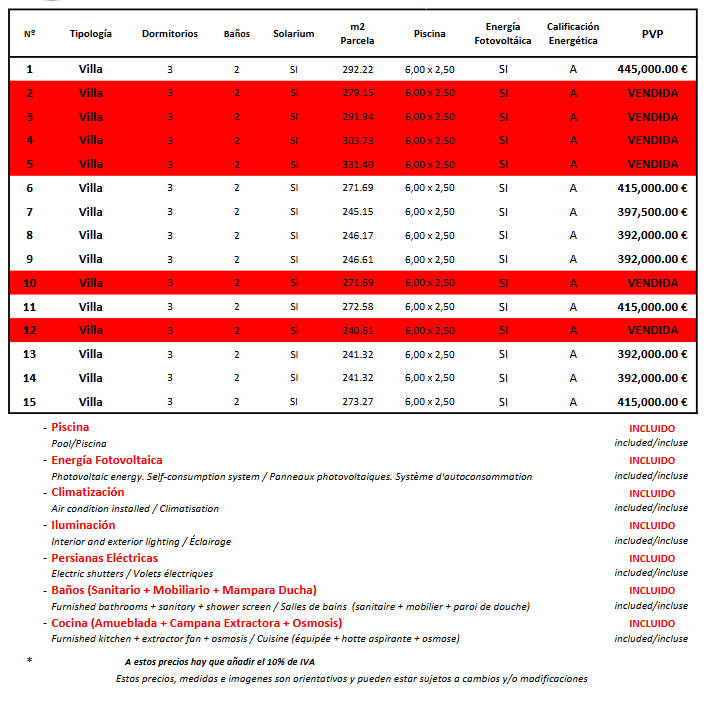 The prices listed are excluding 10% IVA (VAT). You should also take into account the stamp duty (1,2 to 1,5%) that is charged on a new property. Also keep in mind the costs of a lawyer, notary and the transfer of gas, electricity and water. And, if necessary, arranging NIE numbers and opening a bank account. For convenience, you can calculate that the cost on top of the purchase price is around 14%.