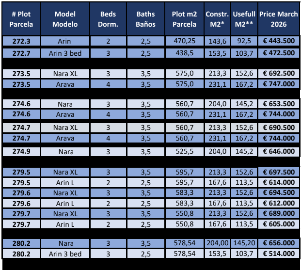 The prices listed are excluding 10% IVA (VAT). You should also take into account the stamp duty (1,2 to 1,5%) that is charged on a new property. Also keep in mind the costs of a lawyer, notary and the transfer of gas, electricity and water. And, if necessary, arranging NIE numbers and opening a bank account. For convenience, you can calculate that the cost on top of the purchase price is around 14%.