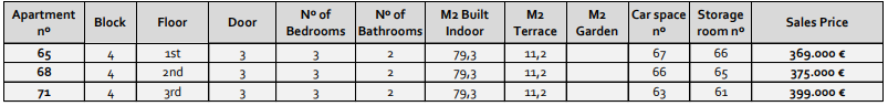 The prices listed are excluding 10% IVA (VAT). You should also take into account the stamp duty (1,2 to 1,5%) that is charged on a new property. Also keep in mind the costs of a lawyer, notary and the transfer of gas, electricity and water. And, if necessary, arranging NIE numbers and opening a bank account. For convenience, you can calculate that the cost on top of the purchase price is around 14%.