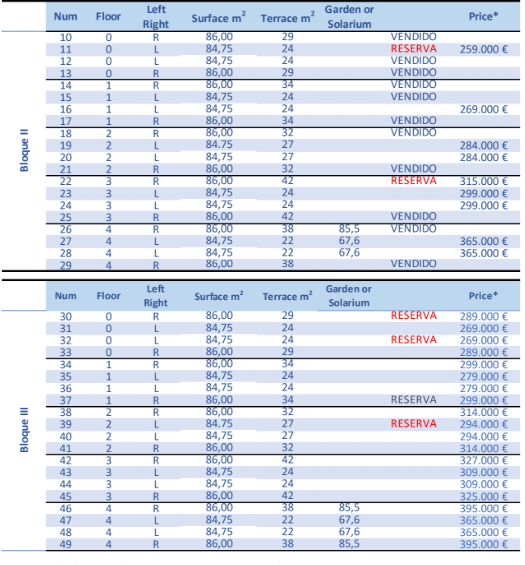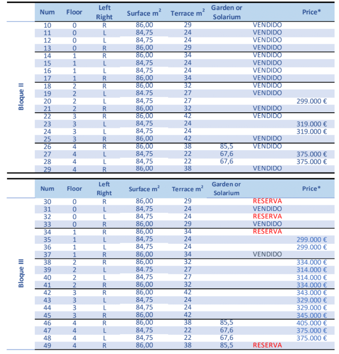 The prices listed are excluding 10% IVA (VAT). You should also take into account the stamp duty (1,2 to 1,5%) that is charged on a new property. Also keep in mind the costs of a lawyer, notary and the transfer of gas, electricity and water. And, if necessary, arranging NIE numbers and opening a bank account. For convenience, you can calculate that the cost on top of the purchase price is around 14%.